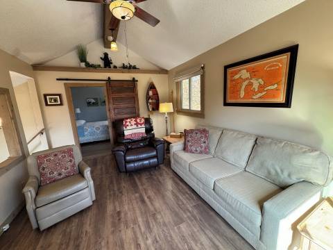 在这间三卧一卫的乡村度假屋中,尽享宁静祥和。度假屋坐落于10英亩的林地之中,拥有舒适的室内空间、中央空调、户外露台以及带围栏的狗狗活动区。这里是远程办公、放松身心或在一天探险之后休憩的理想之所。您可以漫步于度假屋内,或前往附近的公园滑雪/徒步,亦可前往一流的高尔夫球场,欣赏湖泊美景,或驾驶全地形车/雪地摩托驰骋于当地的林间小径。度假屋靠近高尔夫球场和湖泊。需借助楼梯方可进入。提供房车停车位。