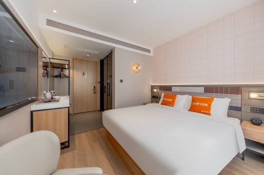 门厅虽然不大,但是“五脏俱全”,茶水台品类齐全,洗衣房,健身房都有。前台的3位美女服务热情周到,笑容和煦阳光,有一扫心中阴霾的力量。房间虽不大但不局促,布局合理,马桶间(智能马桶哦)和淋浴间是玻璃门隔开的彻底干湿分离,床品洁白舒适,整个房间打扫的一尘不染。很不错,很推荐!