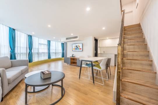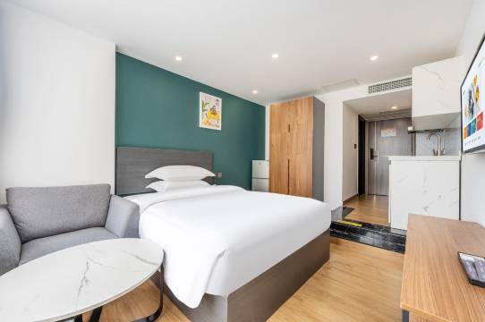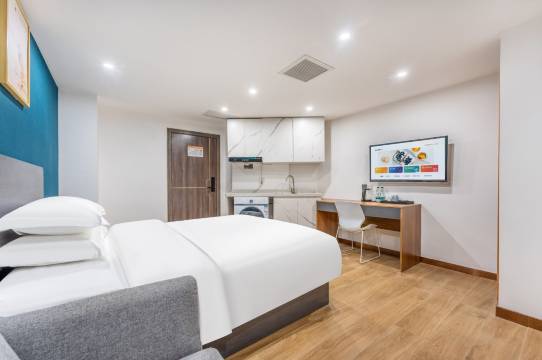位置超棒,想吃啥都有。地铁口就在楼下20米,酒店风格清爽,冰箱,洗衣机超级全。床很软,很舒服,一下子就睡着呢。值得推荐,秒杀很多公寓甚至酒店。👍👍👍👍