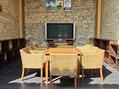 客栈在山窝里面。前面有农田, 稻子收割完还可以在稻田里做窑鸡,露营。老板热情,房间很新,茶室提供给我们用。