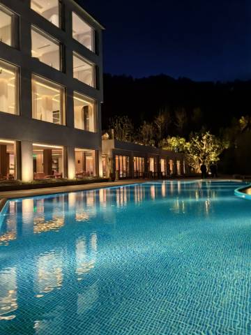 设计:酒店外立面是清水混凝土风格,造型错落有致。特别是晚上的灯光下,暖色的灯光和灯光阴影所勾勒出的线条,行程了冷暖的对比,便利超级出片。
