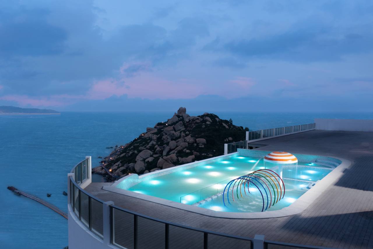 位置很好,海边栈道非常漂亮,中间有点探险的感觉,早上房间可以看海上日出,傍晚爬上桌子山可以看海上日落,退潮还可以赶海,顶楼无边际泳池很漂亮还带一个温泉池,长辈孩子都喜欢。美中不足是早餐很一般。
