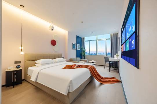 房间很大,很干净,卫生间很宽敞,床也挺舒服的,点外卖有机器人送到门口,非常方便,最让我惊艳的是全屋智能系统,不用自己动手喊小度就可以啦,住了三晚体验感很好,比如家和汉庭更加现代化哦