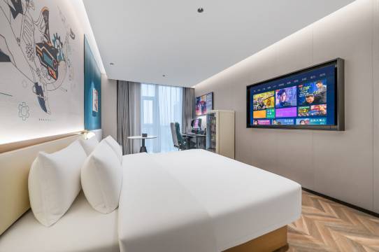 房间宽敞明亮,电竞区和休息区划分合理,软乎乎的大床让你玩累了就能快速回血。周边配套超便利,楼下全是美食店,购物、出行都方便,免费停车场+行李寄存服务超贴心。24小时热水、免费Wi-Fi、零食自助区一应俱全