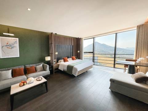 房间面积大,浴缸大,大的落地窗能看到远处的群山,落日余晖,璀璨星河,环境很美,这些都很不错,但是周围没什么玩的,也没啥吃的,晚上酒店吃的火锅158元一份,没啥东西,不值,服务员就两三个人,忙不过来的感觉,早餐东西很少,整个酒店人很少,有一种孤独感,除了在酒店房间看电视和泡澡就没什么能做的了,卫生间早上反味严重,地板有灰尘,体验感一般,酒店服务人手也不够,不过基本有求必应,总体还行,差强人意吧!