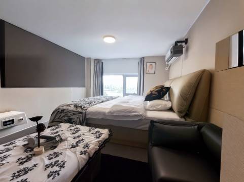 第一次住到这种隔断房,上下层隔断的,就楼层很低了,有点压抑,我们住上层,整体凑合住住还可以,我们提早到上午就入住了加了点钱,楼下就是个公园逛逛挺不错的,离地铁站稍微得走蛮多路的,所以我们打车出行的。