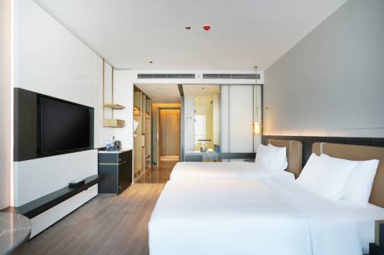 一踏入大堂就被惊艳到,简约有格调的设计搭配淡雅香氛,公共区域的绿植生机勃勃,瞬间驱散了旅途疲惫。房间更是惊喜满满,宽敞明亮且采光通透,角落清洁无死角,完全看不到灰尘和污渍。纯棉床品柔软亲肤,床垫支撑力刚好,搭配100%遮光的窗帘和出色的隔音效果,夜晚安静到极致,一夜好眠超舒心。卫生间干湿分离彻底,热水供应充足稳定,洗漱用品品质上乘,就连床头的USB充电接口、可调节阅读灯这些小细节都设计得格外人性化。
