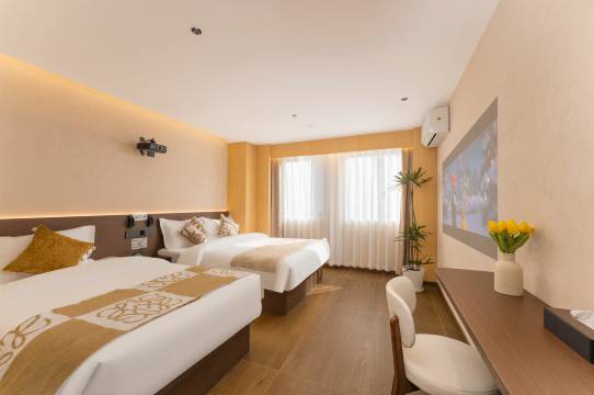 房间装修很新的,床上用品干净卫生,全屋智能,投影清晰,小朋友喜欢看动画片。总台小哥服务很好,打扫卫生阿姨亲和力强,卫生打扫得彻底干净。酒店地理位置优越,离地铁站只有100来米,很方便出行。