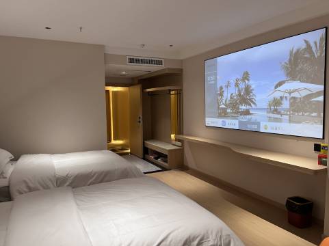房间干净整洁,还免费延迟到了五点退房,前台小姐姐服务态度也很好,还有免费的夜宵和早餐,房间里配备的都是全智能的小度语音,开空调拉窗帘啥的都很方便,强烈推荐出行的朋友入住他家!