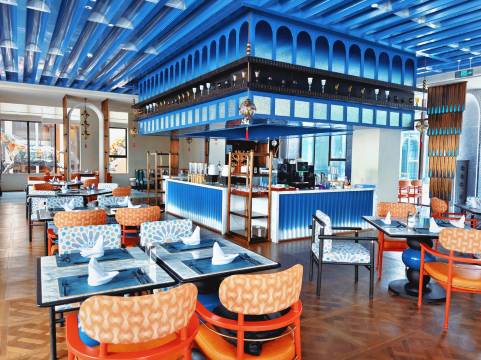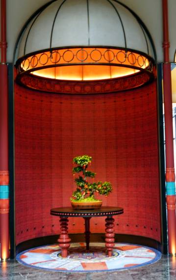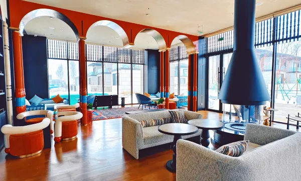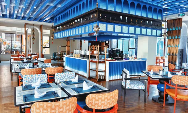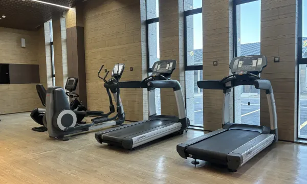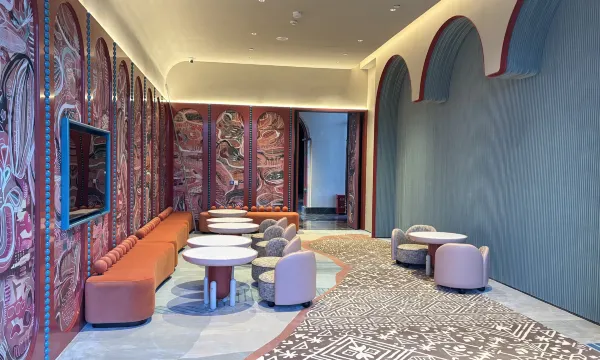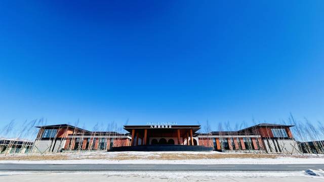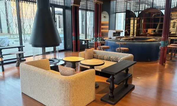 难忘的一晚,踏入酒店大堂的瞬间,便被浓郁的地域氛围感包裹。红棕色的墙面搭配波浪形金属灯带,像极了新疆草原的起伏轮廓;地面的花纹地毯织入哈萨克族的图腾纹样,与廊柱上的雕花格栅相映成趣,仿佛将湖光山色搬进了室内。穿过拱形廊道时,光影透过镂空的金属装饰洒下,在光洁的大理石地面投下斑驳的图案,恍惚间竟像是行走在新疆的古村落巷道,一步一景,皆是巧思。