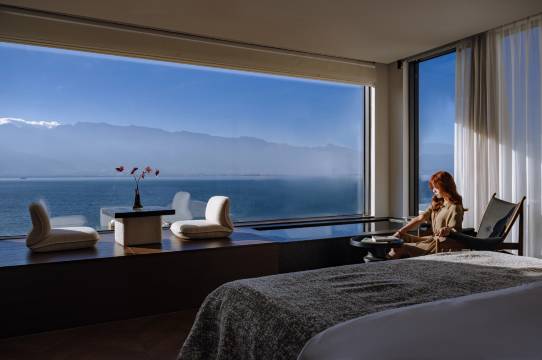 房间本身更是让人惊艳,全屋智能设计,灯光、窗帘、空调一句话就能控制,科技感十足又方便。最让我心动的是私密露台,坐在上面就能将洱海美景尽收眼底,清晨看日出洒在湖面,傍晚赏夕阳余晖,每一刻都美得像画一样。