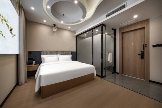 房间干净整洁,语音操控灯光,电视,咖啡,茶水,免费提供好多,服务也好,交通便利,出门就是高铁站!㊗️老板生意兴隆!