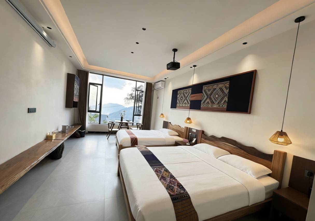 房间通透采光好,布置的简约时尚,卫生打扫的干净整洁,床品舒适无异味,离景区近,周边环境优美,空气清新,店铺还有千年古树茶品鉴,住的玩的都很舒心
