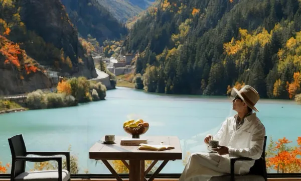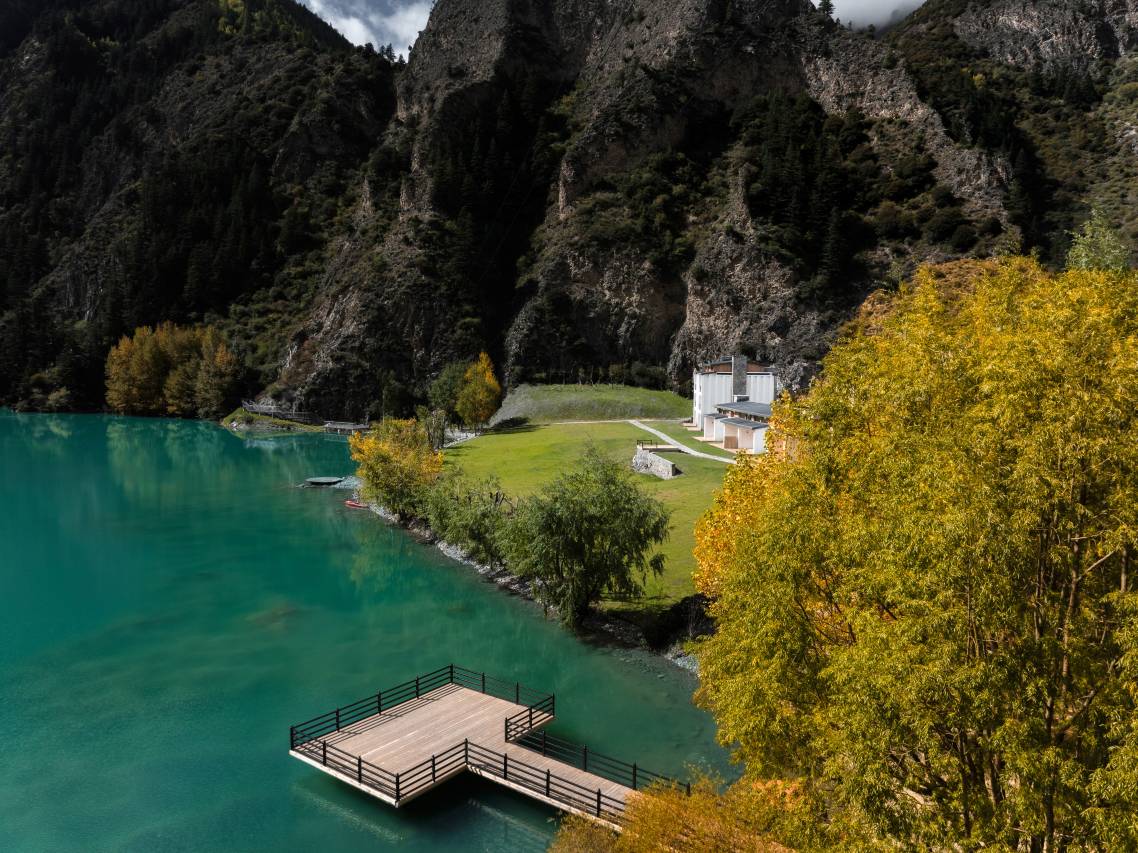 酒店坐落于夹金山国家森林公园、世界自然遗产大熊猫栖息地的保护区内。海拔2800-2900米,全屋配备地暖,窗外就是夹金海子,酒店巧妙融合传统藏式碉楼与现代极简设计,将高原藏式肌理与奢华舒适无缝衔接,每扇窗都框住一幅流动的雪山海子画卷。