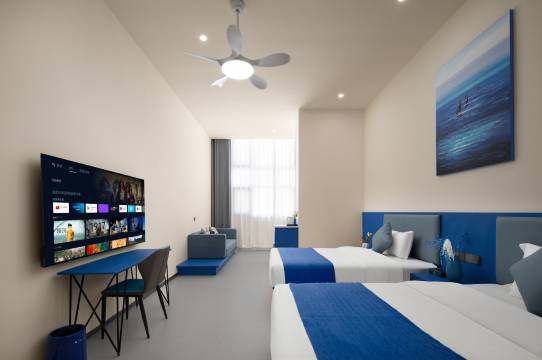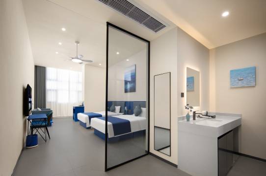 蓝色系装修清新治愈,房间干净整洁,住着很舒服。设施新且齐全,接送机准时,服务细心周到。楼下就是商圈,吃饭逛街超方便,整体性价比很高,值得再来。
