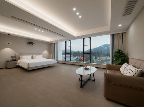 房间宽敞明亮,装修是简约现代风,干净又温馨。床铺柔软舒适,一觉睡到自然醒,完全没有旅途疲惫感。超大的落地窗和独立小院是最大的惊喜!拉开窗帘就是山景,清晨被阳光和鸟鸣唤醒,傍晚在小院里吹吹风,氛围感直接拉满。