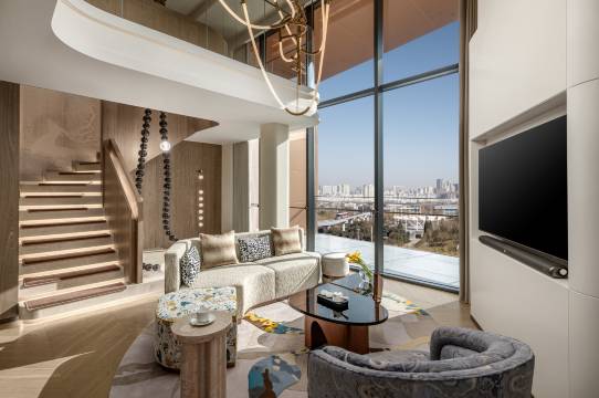 客房: 复式套房的挑高空间感无敌。细节处非常用心,配有戴森吹风机,艺术化的梳妆区设计感十足,色彩材质的搭配也非常高级,住起来很舒心。