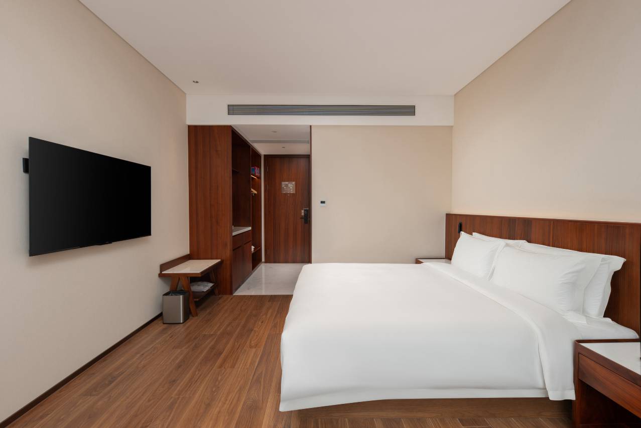 房间的整体体验同样无可挑剔。我入住的雅静大床房,空间宽敞明亮,装修风格简约现代,细节处尽显用心。床品柔软舒适,让我在一天的奔波后能迅速放松下来,一夜好眠。房间内的55寸投屏、热毛巾架等智能设施,不仅提升了入住的便利性,也让我感受到了现代酒店的科技感。最让我印象深刻的是卫生状况,无论是桌面、地面还是卫浴间,都一尘不染,完全符合我对高品质酒店的期待。
