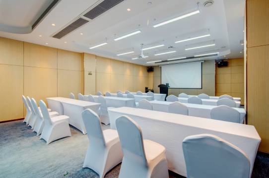 酒店前台服务挺好的。酒店的旁边有好多好吃的。记得跟天猫精灵说话,她会帮你开灯开空调开窗帘,她还会跟你聊天,哈哈哈哈哈,好智能现代化。