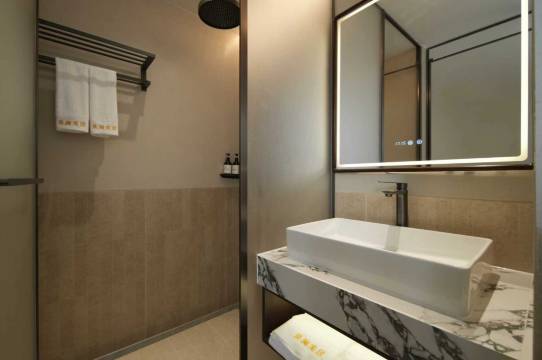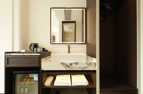 房间整体很清爽😍😍,采光特别好,大大的窗户正对着外面的山景,早上不用闹钟,被阳光和满眼的绿意叫醒,整个人都很放松。房间收拾得干干净净,床品柔软,睡起来很踏实,卫生间是干湿分离,用着方便也不潮湿,吹风机、马桶这些小细节都做得不错😌👍,住起来很舒心。