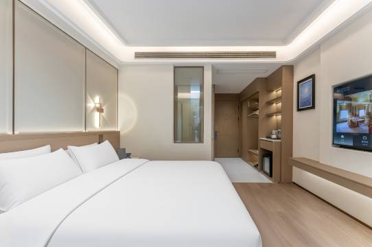 酒店设施全新,工作人员热情,从入住到退房每个环节都让人满意。房间很大,智能设备很方便,外卖都是让机器人送到很安全。早餐厅虽然不大,但是品种中西餐都有,煮面的阿姨很热情,还有特色的竹筒黑糯米饭,很颗粒饱满很好吃,过年一人骑行临时订的酒店,很满意。