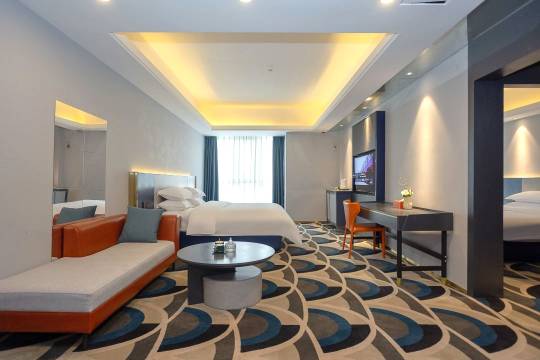 很漂亮的一家酒店,酒店装修很新,卫生干净,床垫舒服,床上用品也是新的,餐饮一条衔,距离高铁站很近,他们楼下还有一个2000平米的高端打茶楼,下次一定在来。
