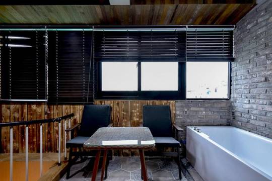 我喜欢这家酒店。我们很惊讶房间是两层的。一楼有一张单人床和一个带淋浴的卫生间,二楼有一张双人床、一张桌子和三把椅子。一楼和二楼都有电视,还有一个装有水和饮料的迷你冰箱,一台电脑,以及二楼的一个按摩浴缸。卫生间只在一楼,所以不是很方便。房间里有烧水壶、两件浴袍、拖鞋、毛巾、牙刷、爽肤水和面部乳液👏👍、吹风机、直发器、化妆品小样、茶和咖啡。一楼可以煮拉面,还有咖啡机、微波炉和制冰机。房间里有无线网络和YouTube Premium 👏👍。尽管酒店各处都挂着禁止吸烟的牌子,但我对气味非常敏感,房间里有很浓的香烟味,所以我扣了一颗星。房间里的空调位置不好,直吹我的头,所以我生病了🤧😢。酒店老板娘是个好人。附近有一家商店。
