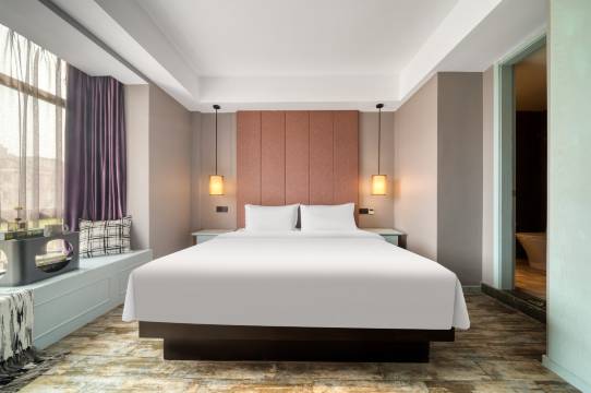 当你踏入酒店的大厅,会有一种破败的奢华感,这里有复古艺术装饰品搭配旧木框,透露着岁月的气息;不加修饰的水泥墙面和裸露的红墙砖,别具一格;错落有致的咖啡机和壁炉相互映衬。酒店不同楼层过道采用不同装修风格。这里有原木色木架、和式壁画相呼应构成日式风,简约而温馨;工业风吊灯以及暗沉的色调搭配的现代风,豪华又不失稳重。
