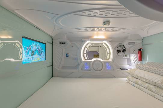 酒店配有100兆光纤高速无线上网、私密独立的豪华太空舱、网络电视、蓝牙头戴式耳机、LED照明、阅读灯,负离子换风进风系统、烟感报警、消防灭火瓶、梳妆台、电吹风、拖鞋 rt高档酒店纯棉布草、24小时热水洗漱、冷暧空调、消毒鞋柜、行李箱智能柜、免费WiFi,高速上网、前台保险柜、大件行李寄存、24小时管家式服务、自助洗衣房、零食饮料自动售卖机;酒店设有宽敞舒适的休闲区,客人可在此阅读上网会客用餐。