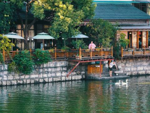 她们家的主人很客气,睡的床也很舒服,江边散步风景不错😌,还有两只大鹅很可爱!起来的早晨下着蒙蒙细雨,真的很有江南古镇的味道,很棒很棒