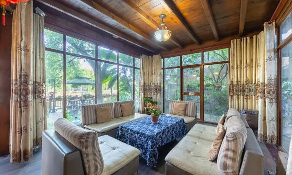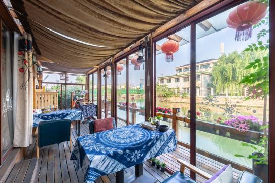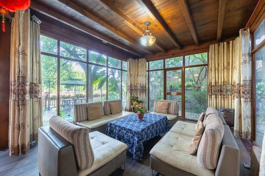 后花园很漂亮,有颗高高大大的柚子树,挂满了金黄色的大柚子,还有一颗金桔树,也挂满了金灿灿的小金桔。毗邻小河栈道的阳光房,种满了鲜花,很温馨。酒店设施比较老,但是离广济桥很近,毗邻景区核心位置。