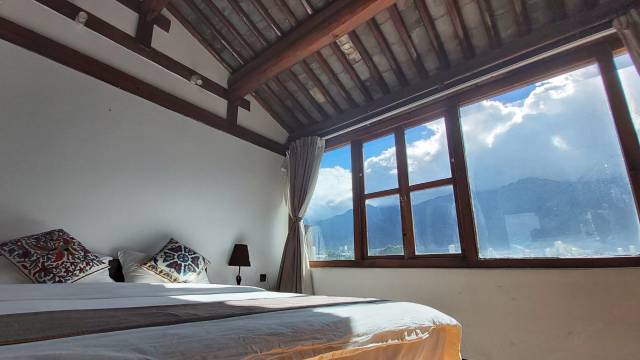 订的景观套房,整体装修很淡雅,顶层房间建筑特点明显,设施设备比较齐全,套间观景绝佳,可一眼望苍山,非常棒的入住体验。