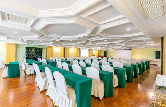 酒店建筑面积12000平方米,大楼整体气势宏伟,集住宿、餐饮、会议、休闲娱乐于一体,设施完善的商务度假型酒店。酒店背依翠山,清静优雅,豪华舒适,融合欧式古典风格和现代设计理念,别具一格。