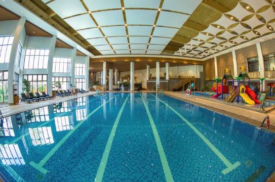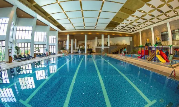 山庄设有6600平方米的温泉洗浴中心,可供700人同时洗浴,包含室内游泳馆和室外露天浴区。