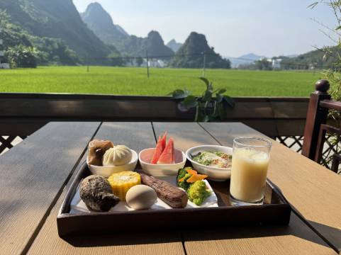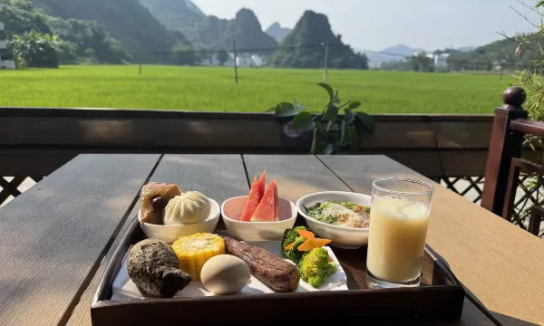 酒店就在百鸟岩景区附近,窗外就是盘阳河,晚上听着潺潺的河水入睡,早晨被欢快的鸟儿们叫醒,坐在窗边泡壶茶,看着远处的群山,体会着“偷得浮生半日闲”,真是快哉。这离百魔洞和水晶宫都很近,原本就打算逗留一天,结果住的太舒服,连续住了三天,饿了就去对面村子的大自然乡村饭店吃饭,真是可以当做食堂,有来巴马旅游的朋友,可以考虑一下