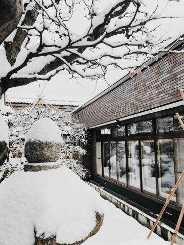 我们的房间在一楼,可以看到很漂亮的日式庭院,虽然恰逢大雪纷飞,庭院的景致被皑皑白雪暂时遮掩,有一些可惜,老板说到五月院子会非常漂亮,可以想见春夏时节,这里定是繁花似锦、绿意盎然的绝美画卷,期待下次在温暖的季节再来感受这份生机。