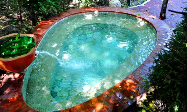 酒店以原生态、园林式露天温泉为特色,依山傍水自然呈现的坡地修建而成,景区内分布着保护完好的大片原生态林海、山、水、湖、树、相得益彰,近百种绿色植物相互映衬。