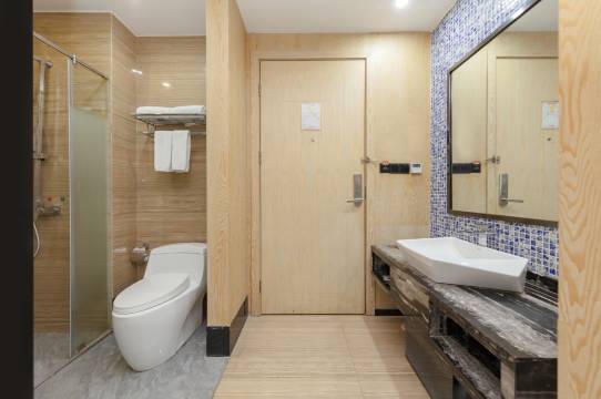 酒店大堂挺气派的,位置好找,有免费停车场比较方便,房间整体干净整洁,前台有免费茶点可以吃,老板人比较好,还给免费预约了天空剧院的门票,下次有机会再来