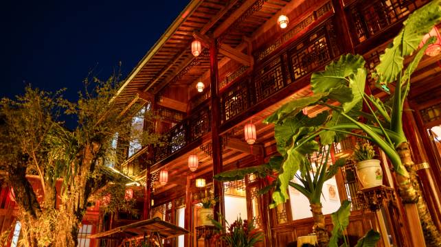 房间干净卫生,错落有致,庭院花草春意盎然,夜间大红灯笼高高挂,古色古香,小桥,翘脚亭,古树,别有一番风味。