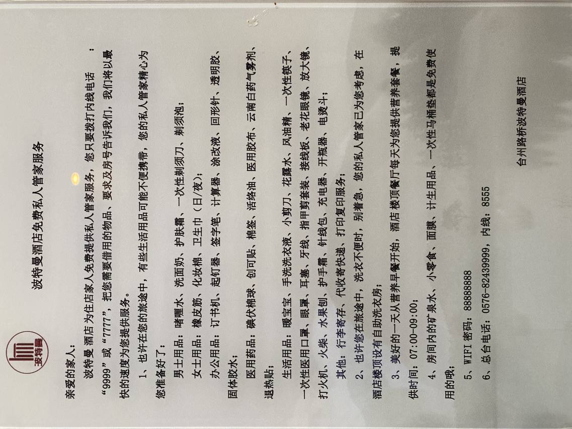 酒店位于台州路桥区马铺路,酒店周边繁华汇聚,临近美食一条街,台州特色美味琳琅满目;毗邻台州国际会展中心,商务出行便捷高效;与中盛城市广场咫尺之遥,购物休闲随心所欲。 酒店交通便利,距台州市国际会展中心很近,临近路桥十里长街景区、中盛城市广场 、路桥机场、台州站,轻松畅达城市各处。客房内,梦百合零压床垫与记忆棉床垫相得益彰,助您一夜酣眠,驱散旅途疲惫。大屏液晶电视支持手机无线投屏,畅享大屏视听盛宴。此外,房间贴心提供矿泉水、小零食、计生用品、面膜等,更有私人管家随时响应,酒店休闲大堂区氛围闲适,早餐厅精心准备营养丰富的早餐,以美味唤醒活力一天;棋牌室配备完善,为您的闲暇时光增添趣味;自助洗衣房设有洗衣机与干衣机,解决衣物晾晒烦恼,让出行从容无忧。入住波特曼酒店漫游千年古街,探寻商都文明脉络。无论是商务出行、休闲度假,还是会友待客,皆能在此尽享惬意,收获难忘旅行体验。