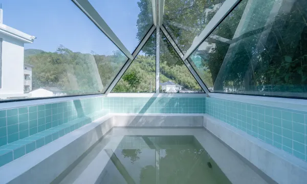 民宿庭院的c位是湛蓝的露天无边泳池,占地200平方米,是莫干山地区顶配的泳池。四周密林层叠的映衬下,像一颗山间蓝宝石,度假氛围感瞬间拉满。在冬季,民宿也贴心地为客人提供露天温泉泡池,一年四季都能尽享舒适体验。