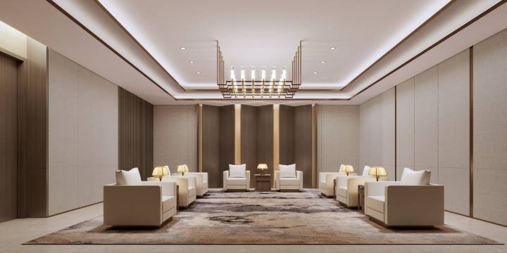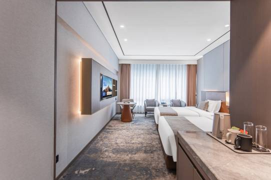 客房设计兼具美学与实用性,全景落地窗将城市天际线或自然风光尽收眼底;床品柔软亲肤,搭配智能温控系统,营造出极致的睡眠体验。卫浴空间宽敞明亮,洗漱用品与雨淋式花洒的细节,尽显品质追求。