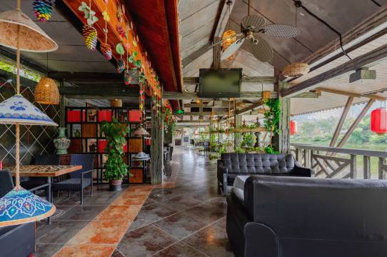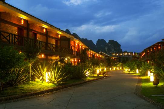 山庄融入壮族民居的建筑风格,两层骑楼式依山而建,拥有独具壮族民俗风情的各式客房。山庄内还设有壮族民居博物园、图腾篝火广场、垂钓场;户外大型舞台上精彩曼妙的民族歌舞表演,明仕河上轻盈惬意的竹排漂流,清新舒心的自行车或徒步游览探密,亦动亦静,遗忘流淌的时光。