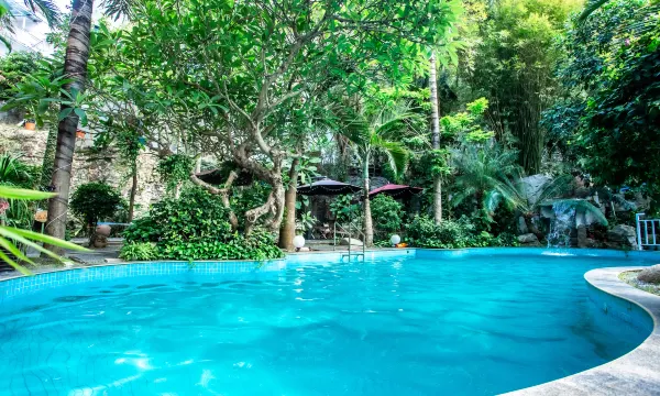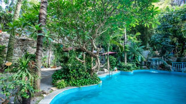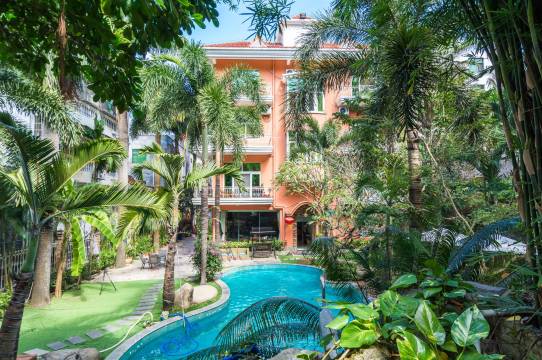 欢迎光临我的民宿,属于独栋带院的4层别墅型民宿,院外有停车场,别墅院内有花园、环境优雅,有霸王棕榈树、狐尾椰子树等多种名贵树种,有游泳池,院内还可以烧烤,配有烧烤炉;一楼属于公共区域,设有前台接待、客厅、茶吧等,二楼设有30平米的公共厨房,配有比较完善的厨房用具,客人可以自己做饭;二楼设有咖啡厅,配有美式咖啡机,可以自己做各种咖啡;房间设置在1—3楼,每个房间都有独立卫生间,房间设施按星级标准配置,床品一客一换;四楼设有楼顶花园;