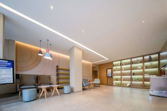 晚上到的,前台小哥哥一个人值班,很多人要办理入住,还是很耐心,还有机器人送餐