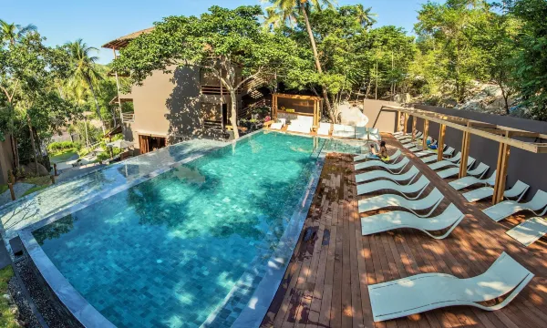 度假的完美选择,就在海边。沙滩很棒——细软的沙子,还有好几个泳池。花200泰铢租个浮潜面罩和呼吸管就能看鱼了。