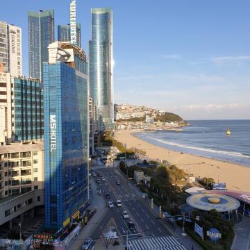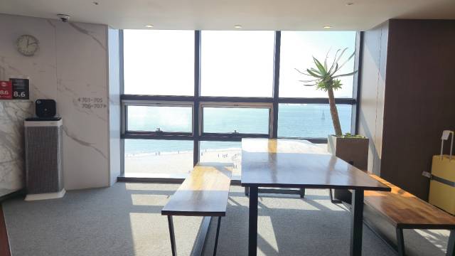 离地铁站很近,走两三分钟就到了,就在沙滩第一排,风景非常棒!前台的韩国姨母很亲切!
