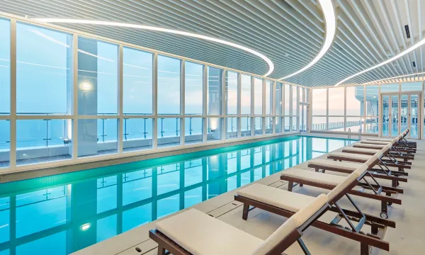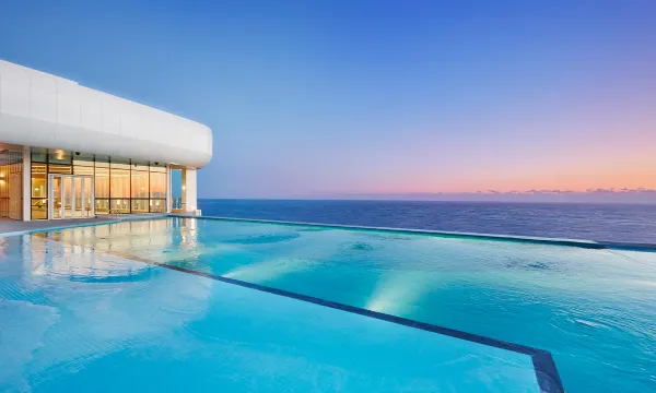 无边泳池很好看,酒店的外形也很好看,确实是这边最好的酒店!健身房、泳池设施很好。一层bhc炸鸡很好吃!