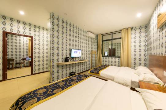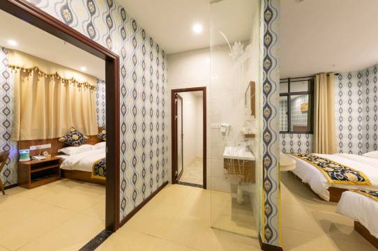 已是第三次入住,对本店的优缺点就更了解了。优势:(1)房价低廉。周边的民宿很多,本店是房价最低之一,而质量并不见得差,因而对仅需借宿一晚的航班乘客而言性价比就太合适了;(2)送机保障。在预约时间前后几分钟一定能乘坐上送站穿梭班车,绝不致于造成误机;(3)卧床宽大卧具整洁。双床房型竟是两张大床,被褥厚实柔软且洁白如雪,睡在其上舒适无比;(4)空调/Wifi/洗浴热水均功能正常。没有带来任何不方便;(5)屋内安静。无论是窗外还是过道都没有噪声打扰。不足:(1)自然光线较弱。窗外约2米左右便是邻接建筑物的墙体,遮挡阳光;(2)室内面积被夸大。下单时标称面积为30平米,推开房门一看:远不足预期。实地估测:卧室充其量也就18平米,卫生间确有4平米之多,如此这般:水分也就太大了些。卧室面积并不大,又摆上两张大床,结果是几乎没有多少活动空间。