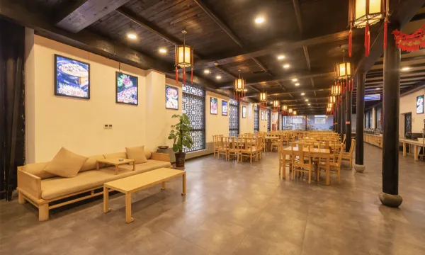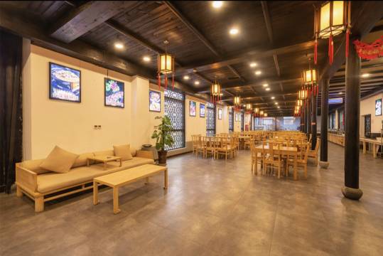 酒店门前小桥流水,颇具风情。大堂采用中式古典木建筑结构,雕梁画栋;整体设计又融合了现代的优雅与简洁,别具一格。楼廊的路面由石板铺设而成,木吊顶和两边的立柱透出沉稳与大气。